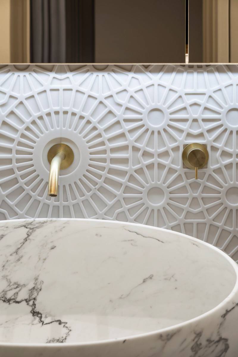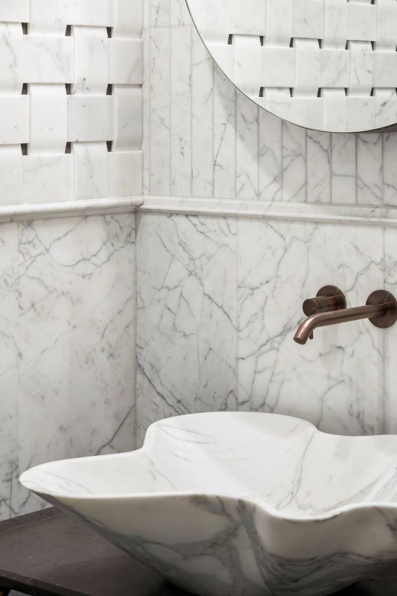 Les murs et les sols de tout l'établissement sont revêtus de pierre naturelle noble, notamment du marbre blanc de Carrare.